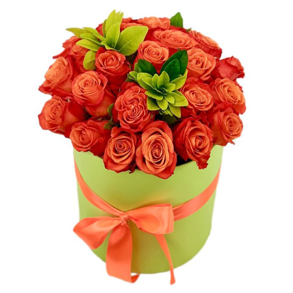 Роза одноголовая красная, зелень. Упаковка (шляпная коробка, квадратный бокс, коробка сердце, оазис)